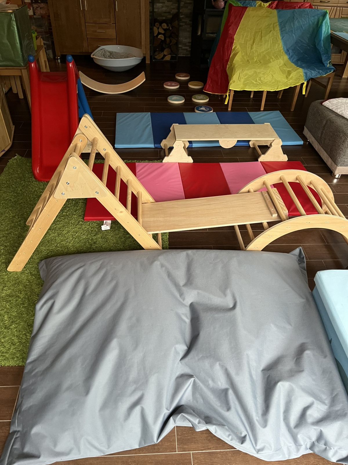 Auch habe ich viele Bewegungselemente wie z.B. Rutsche, Kletterdreieck, Balanchiersteine, so dass wir auch das Wohnzimmer in eine "Turnhalle" verwandeln können