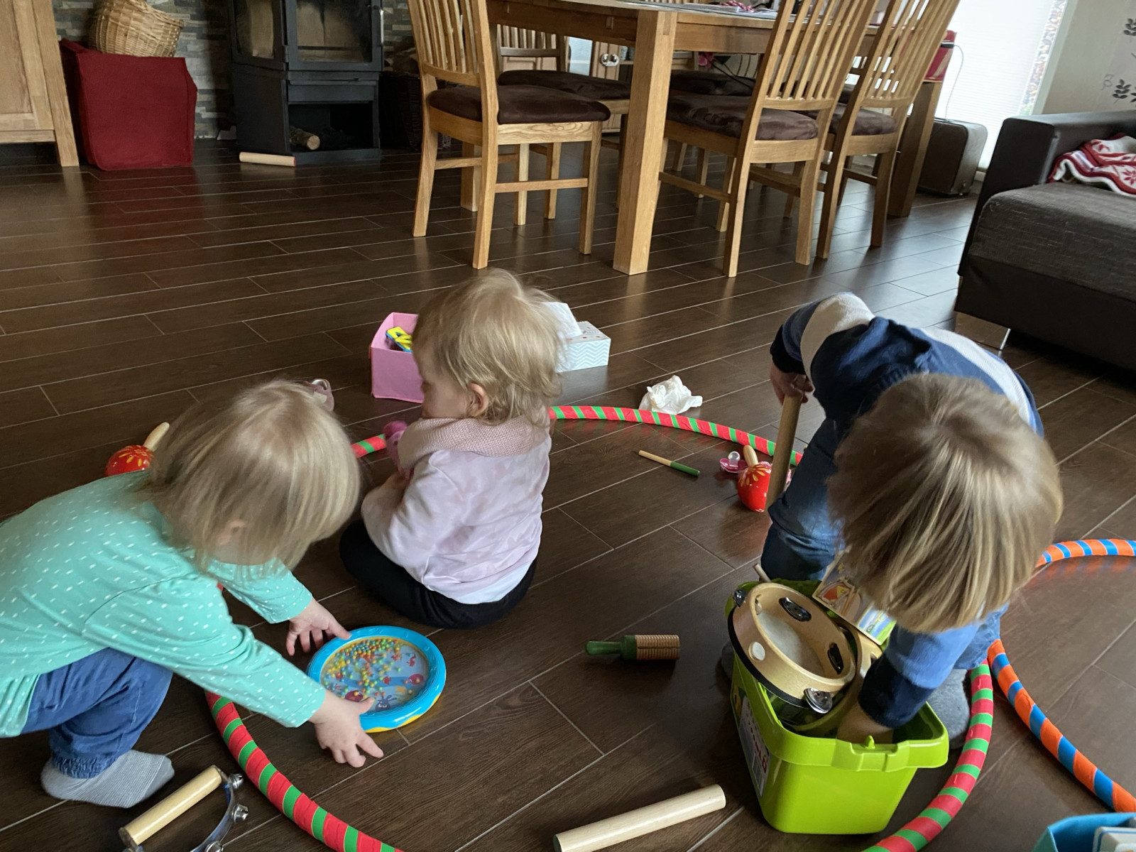 Auch Musik und Singen kommt in meiner Kindertagespflege nicht zu kurz. Durch zusammen gesungene Lieder erweitern und vertiefen die Kinder ihren Wortschatz und lernen schnell, kleine Lieder selbstständig mitzusingen. Ich habe auch einen Vorrat an verschiedenen Instrumenten und Gegenständen, mit denen man Töne erzeugen kann – die Kinder haben damit viel Spaß und werden zu kleinen „Komponisten“.